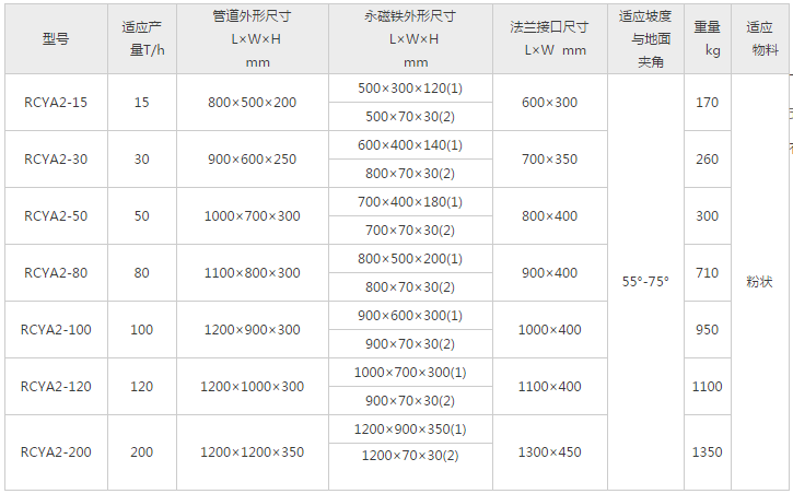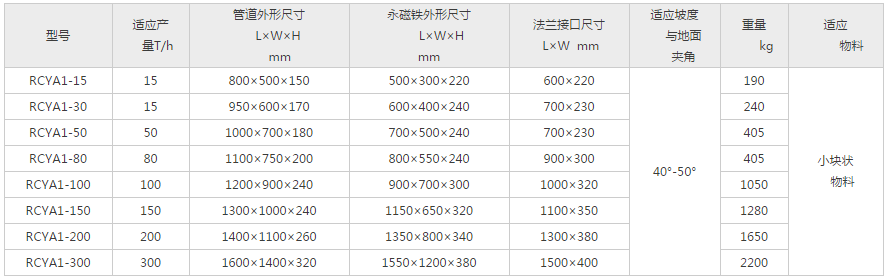 RCYA型傾斜管道式永磁除鐵器分為RCYAl、RCYA2兩種,包括無磁管道和永磁鐵兩部分,專用于封閉管道內非磁性物料的除鐵,永磁除鐵器內部采用高性能強磁材料組成復合磁系。具有體積小、磁力大、重量輕、除鐵干凈、方便、低能耗、使用壽命長等特點。